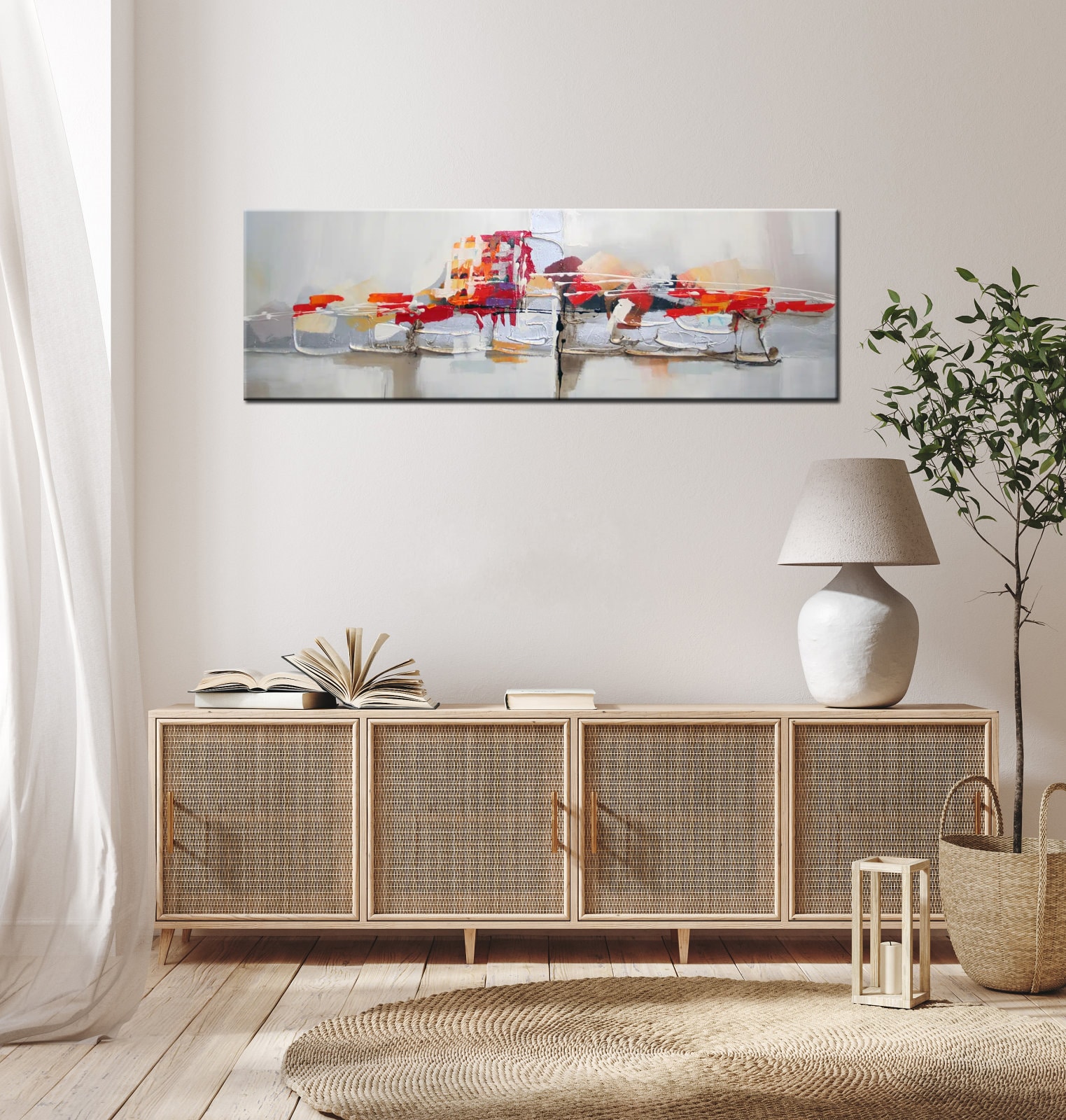 Ce tableau panoramique gris orange mauve abstrait est l'élément de décoration murale idéal pour être placé au dessus d'un canapé dans un salon, au dessus du lit dans une chambre, ou encore au dessus d'un meuble de type console