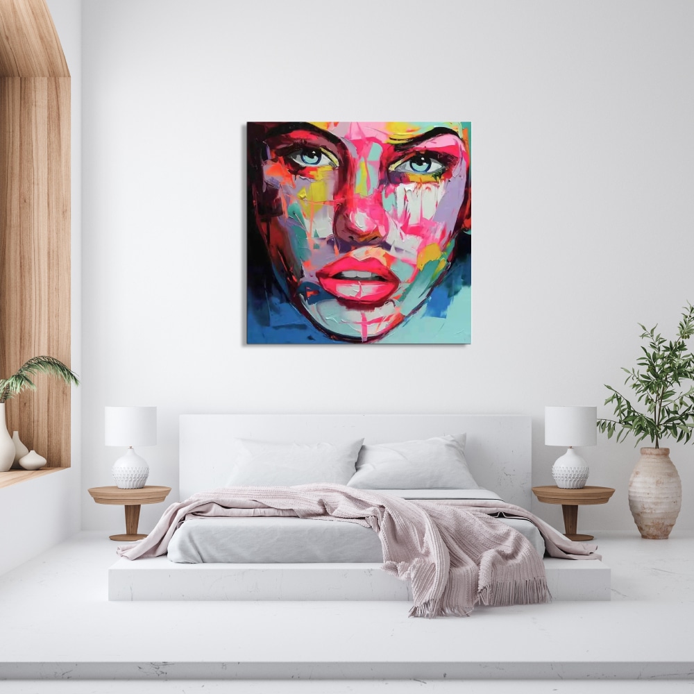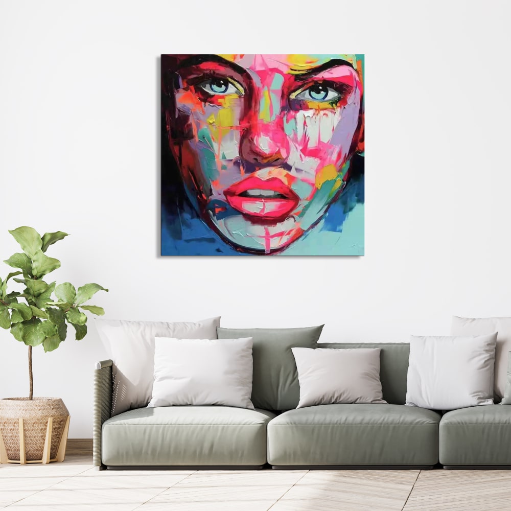 Le format carré d'un tableau est une tendance déco très actuelle : ce visage mystérieux coloré occupera un mur avec une grande autorité et quelles couleurs chatoyantes !