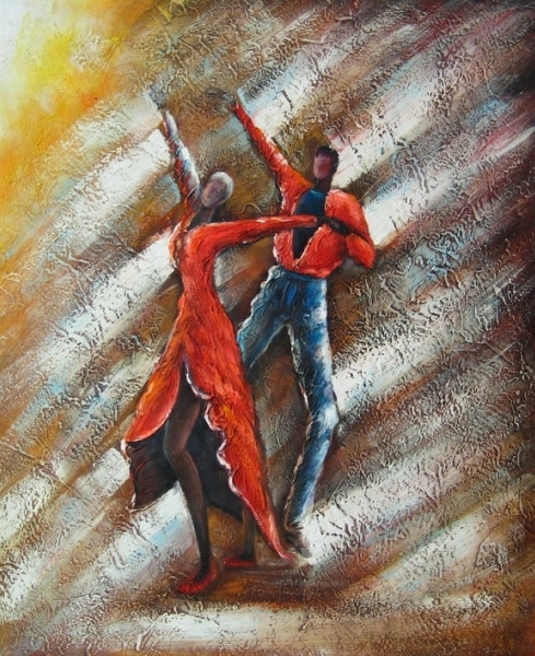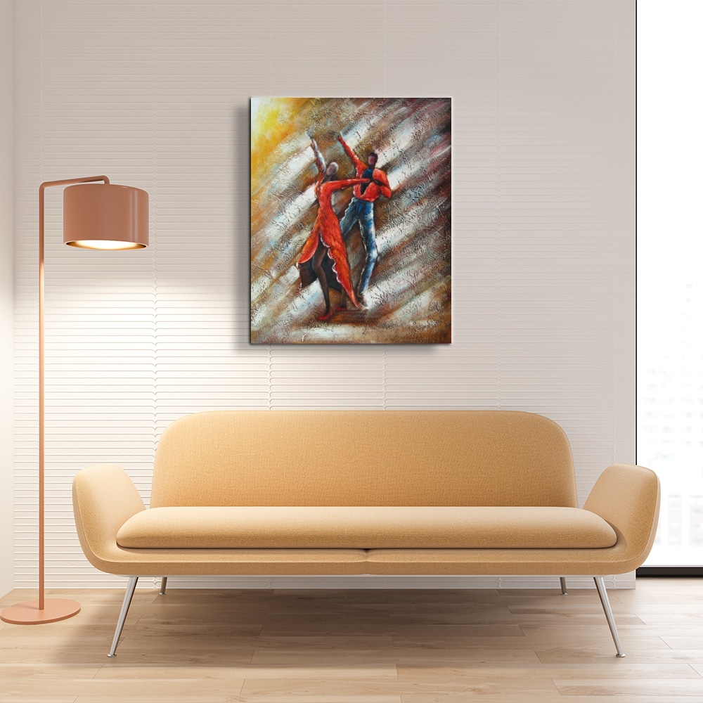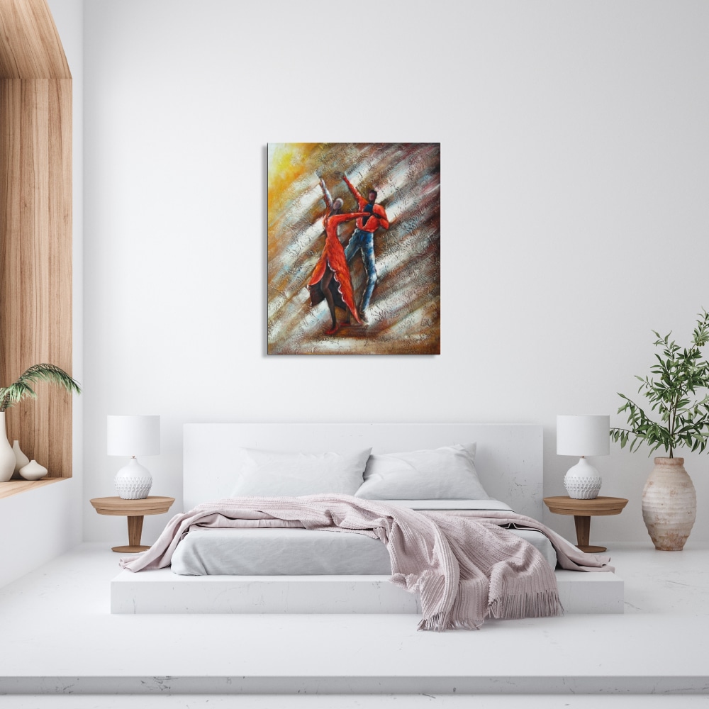Le tableau représente un couple de danseurs de tango, dans une scène moderne et stylisée. L’homme est vêtu d’une chemise rouge et d’un pantalon bleu élégant. Il tient sa partenaire par la main, tandis qu’elle porte une robe rouge éclatante qui contraste avec le fond sombre du tableau. Les mouvements des danseurs sont fluides et gracieux, capturant l’énergie et la passion du tango.