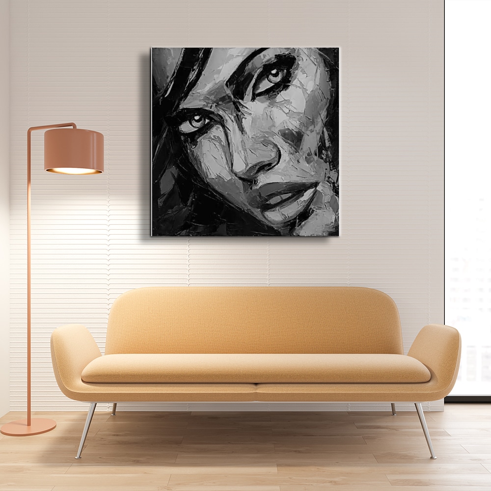 D'abord travaillée au crayon, ce visage est ensuite exécuté à la peinture à l'huile, au couteau, pour apporter de légers effets de reliefs sur la toile de coton : l'effet déco est bluffant, encore plus en noir et blanc.